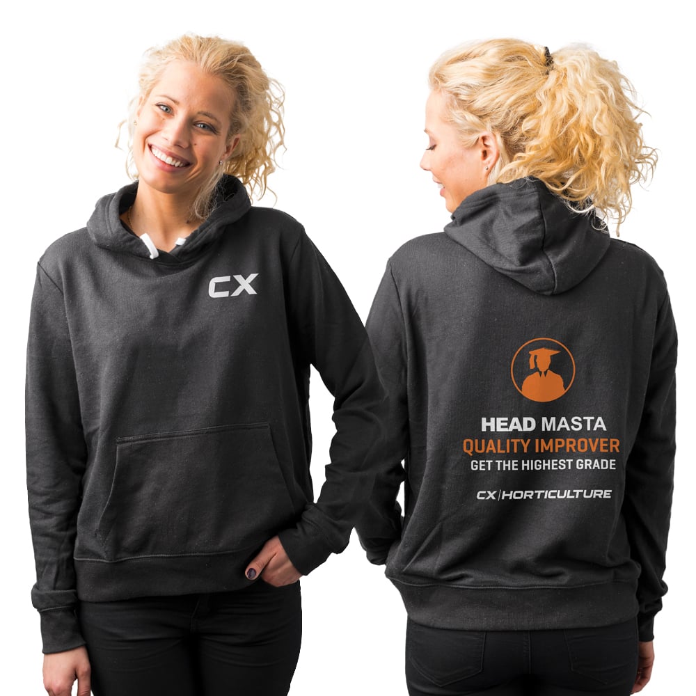 High quality CX Hoodie with thumb-holes in sleeves in dark grey with embroidered logo to front and printed product graphic to rear